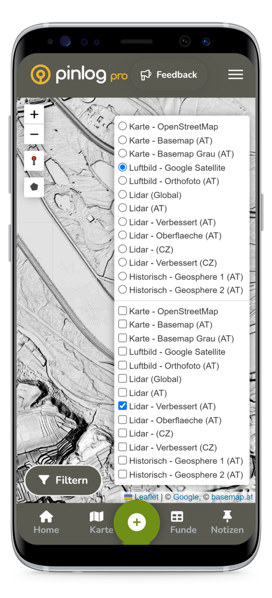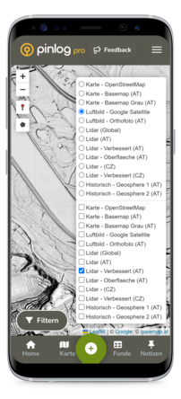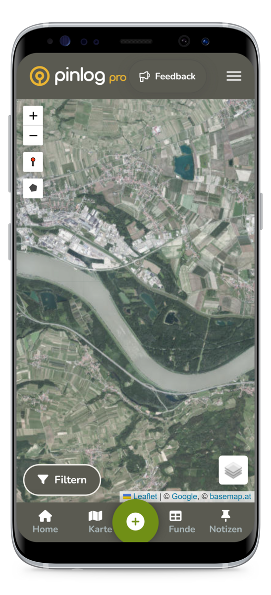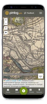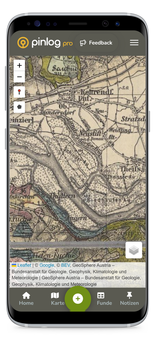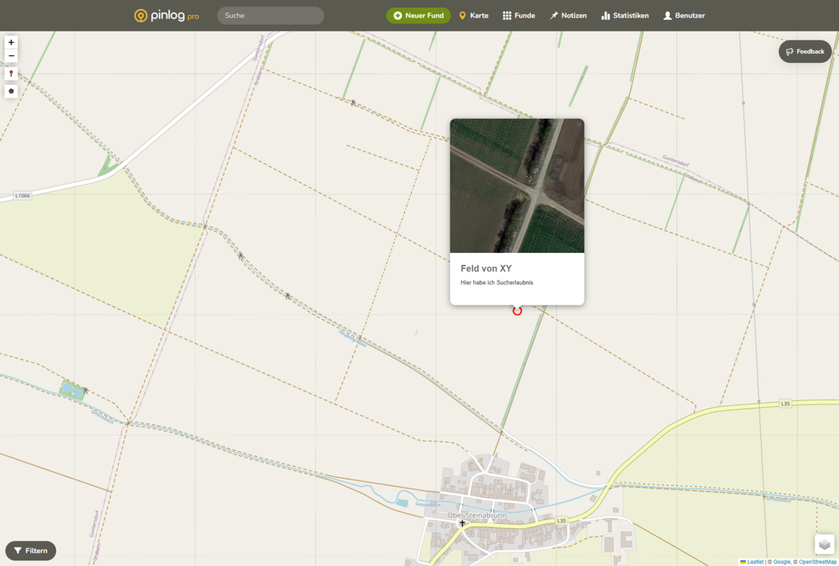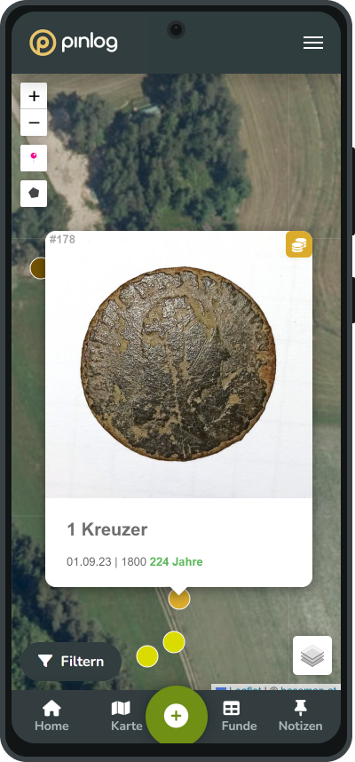 In Pinlog Pro kannst du spezifische Felder und Grundstücke markieren, für die du die Erlaubnis zur Suche hast, oder interessante Stellen, die du z.B. auf historischen Karten entdeckt hast.